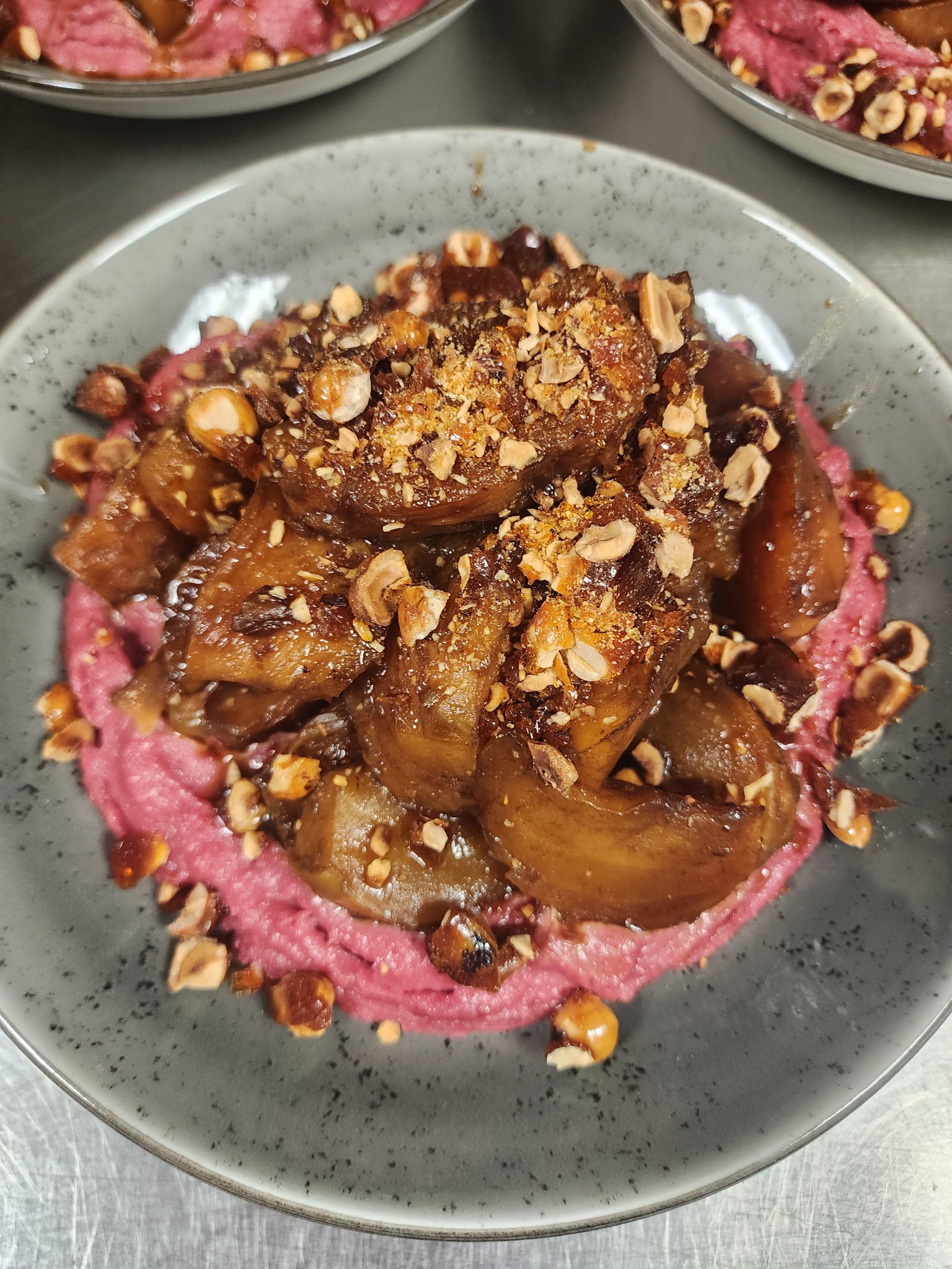 Roasted beet, cashew-beet cream & hazelnut praline, finished with micro greens.