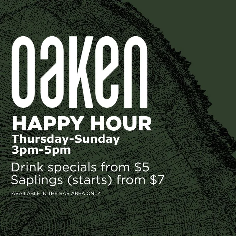 The fix for a long workday: Oaken’s happy hour! Join us Thursday-Sunday from 3pm-5pm for drinks from $5 and appetizers from $7!